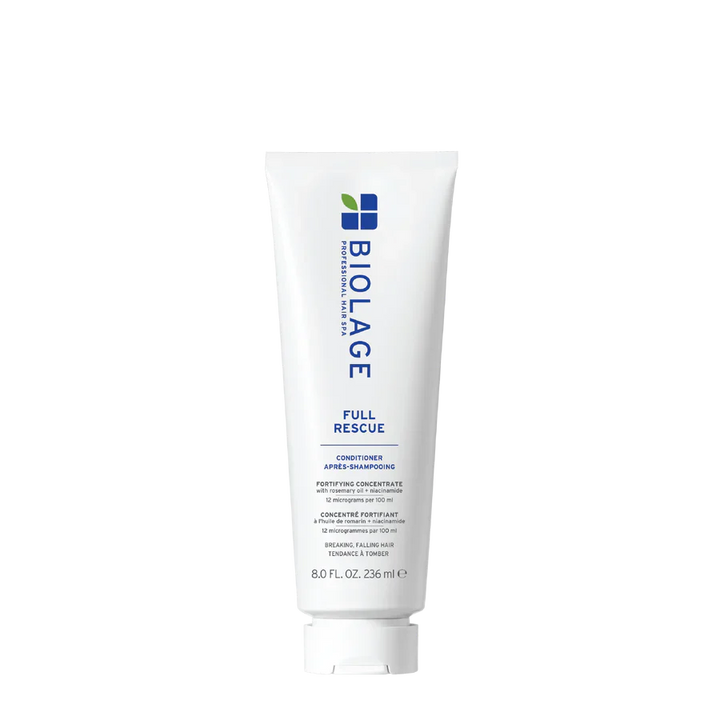Strength meets density in one nourishing step. The Biolage Full Rescue Conditioner delivers instant detangling and weightless density to weak, thinning hair. Infused with a fortifying blend of rosemary oil and niacinamide, it supports a healthy scalp barrier and protects against oxidative stress caused by daily environmental aggressors. This lightweight conditioner helps reduce breakage and hair fall due to brushing by reinforcing strands at the root. Perfect for fine or fragile hair in need of volume and strength.