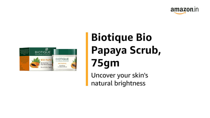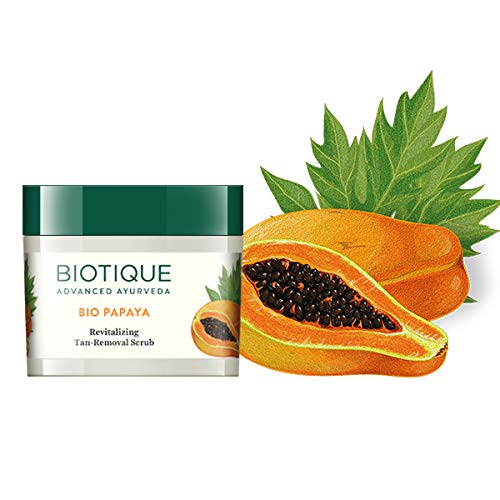The Biotique Papaya Tan Removal Brightening & Revitalizing Face Scrub is a 75g exfoliating product designed to remove tan, brighten the skin, and revitalize it. It is suitable for all skin types and is made from 100% natural, botanical ingredients. The product is chemical-free, cruelty-free, dermatologically tested, and comes in recyclable packaging.