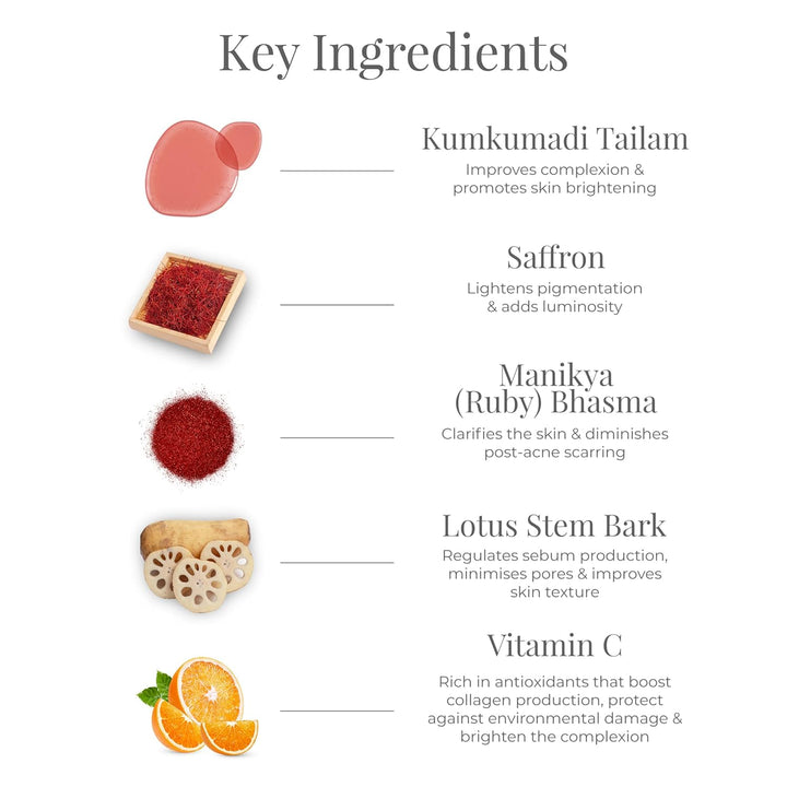 Ayurvedic Formula – Enriched with Kumkumadi Tailam, known for its skin-brightening and healing properties.