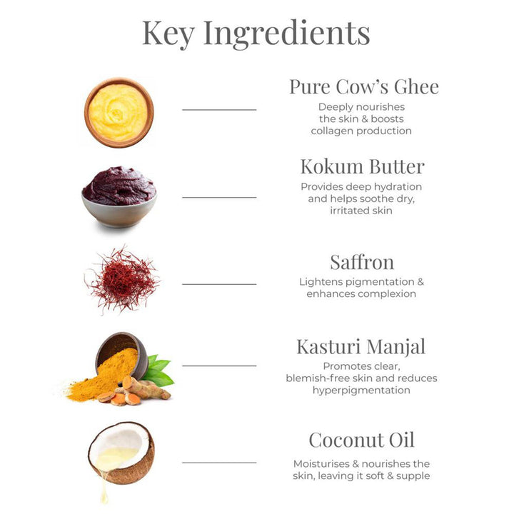 Infused with Pure Cow’s Ghee: Deeply penetrates the skin, carrying herbal actives for maximum nourishment.
