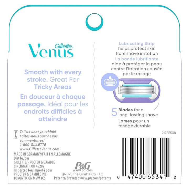 Experience the ultimate in shaving precision and comfort with Gillette Venus Swirl Extra Smooth Cartridges. Each refill features 5 ultra-thin blades that flex and adapt to your body's contours, ensuring a close, smooth shave with no missed hairs. Designed for women who want effortless glide and silky skin, these cartridges are enhanced with a water-activated ribbon of moisture and Vitamin E-infused glide strip to protect and nourish your skin during every shave.