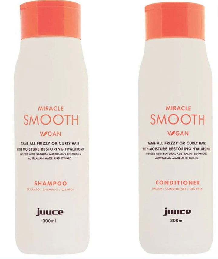 Juuce Miracle Smooth Shampoo and Conditioner tames all types of frizzy, coarse, unruly, very dry hair with intensive smoothing agents to maintain smooth and silky soft hair. Replenishes, detangles and controls frizz and improves manageability. Increases shine. Includes UV, humidity and oxidation protection. Formulated with Hyaluronic Acid and Hydrolyzed Rice Protein.