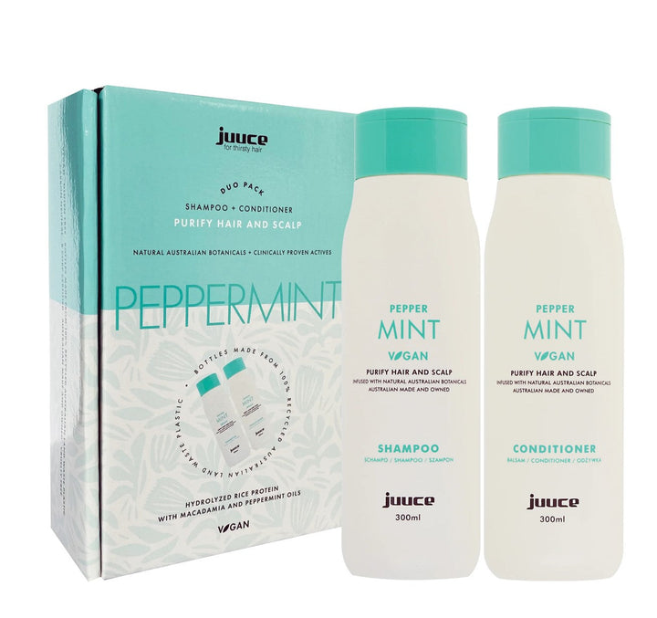 Juuce Peppermint Shampoo and Conditioner is blended with invigorating natural botanicals and oils which treat the hair and stimulate the scalp for healthier, cleaner and stronger hair. Formulated with Hydrolyzed Rice Protein, Macadamia Oil and Peppermint Oil.