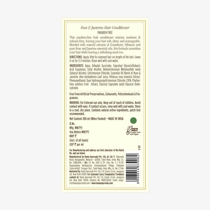 Description: The Rose & Jasmine Hair Conditioner by Kama Ayurveda is a luxurious Ayurvedic formulation designed to nourish, strengthen, and repair hair. Enriched with natural ingredients, this conditioner deeply hydrates and detangles hair, leaving it soft, shiny, and manageable. Its gentle formula is free from SLES, parabens, and petrochemicals, making it safe for everyday use.