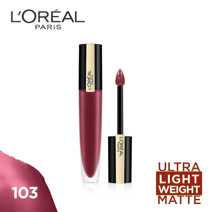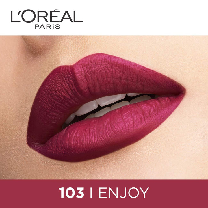 Make a bold statement with L'Oréal Paris Rouge Signature Liquid Lipstick in shade 103 – I Enjoy, a deep plum hue that flatters all skin tones. This ultra-lightweight matte lip ink delivers intense pigment with a barely-there feel, combining the impact of a liquid lipstick with the comfort of a lip stain. Designed for long-lasting wear, it’s your go-to for effortless elegance and all-day confidence.
