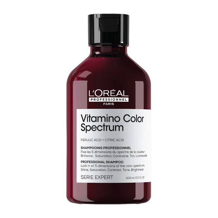 Reveal vibrant, shiny hair with L'Oreal Serie Expert Vitamino Color Spectrum Shampoo. Specially formulated for colour-treated hair, this professional-grade shampoo gently cleanses while locking in colour vibrancy for up to 100 days*. With Ferulic Acid and Citric Acid, it nourishes the hair fibre, enhances colour intensity, and protects against dullness and fading. The patented technology targets five key colour dimensions—shine, vibrancy, contrast, tone, and brightness—preserving the multi-tonal richness of your shade. Ideal for maintaining fresh, radiant colour between salon visits.