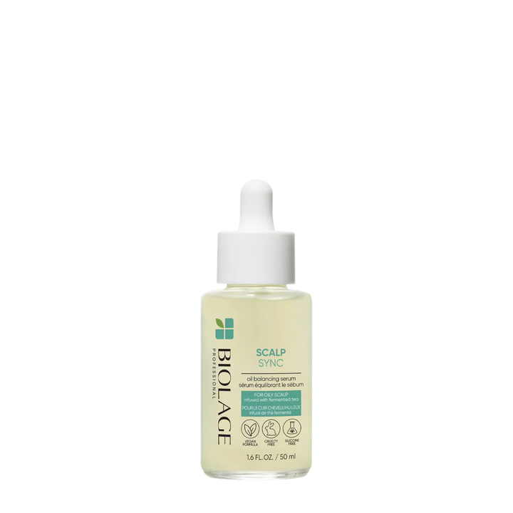 Biolage Scalp Sync Oil Balancing Serum rebalances an oily scalp by absorbing and reducing excess oil. A lightweight leave in serum prevents sebum from traveling down the hair strand with continued use.