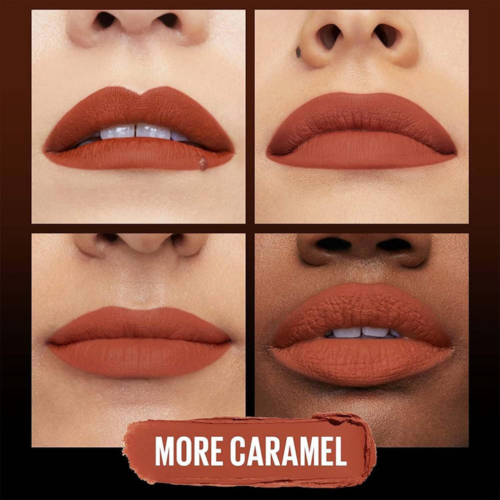 Is More Caramel a matte lipstick? Yes, it offers an extreme matte finish with a soft-blur effect.
