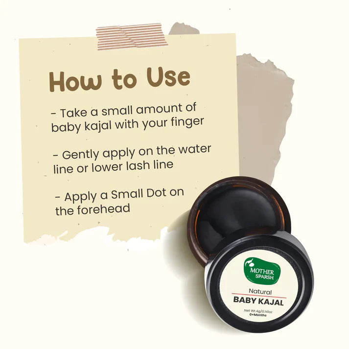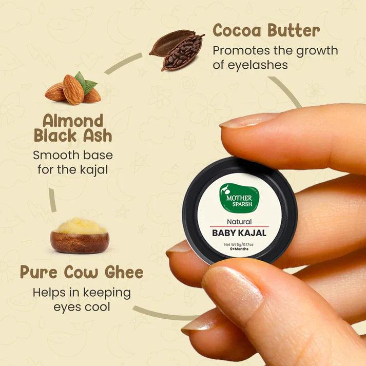 Give your baby’s delicate eyes the gentlest care with Mother Sparsh 100% Natural Baby Kajal. This lead-free, irritation-free kajal is crafted with pure cow ghee, almond black ash, and cocoa butter, ensuring nourishment and protection for your little one’s eyelashes. Designed with all-natural ingredients, this kajal moisturizes, soothes, and safeguards against environmental factors while being completely free from harmful chemicals.