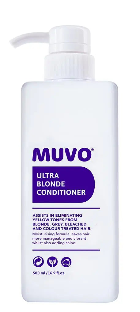 The MUVO Ultra Blonde Conditioner 500ml is a moisturizing formula that helps eliminate yellow tones from blonde, bleached, grey, and highlighted hair while adding shine and preventing fading.