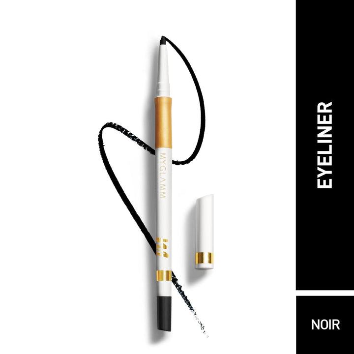 Define your eyes with MyGlamm Jet Set Eyes Kajal Eyeliner - Noir, a fierce black kohl stick that doubles as an eyeliner. This richly pigmented kajal glides on effortlessly, delivering intense definition with a semi-matte finish. Designed for long-lasting wear, it is waterproof, smudge-proof, and transfer-resistant, ensuring your eye makeup stays flawless all day.