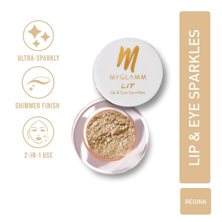 MyGlamm - LIT Lip & Eye Sparkles - Regina (Gold Shade) is available at Kess Hair & Beauty Online Store, ensuring easy access to this must-have beauty essential. Get yours today and elevate your makeup game!