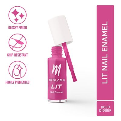 Make a bold statement with MyGlamm LIT Long Lasting Nail Enamel in the electrifying shade Bold Digger—a neon lilac hue that embodies confidence and individuality. This chip-resistant, long-lasting, high-shine glossy nail polish ensures salon-like perfection with every application. Whether you're looking for a playful pop of color or a standout manicure, this nail enamel delivers flawless results.