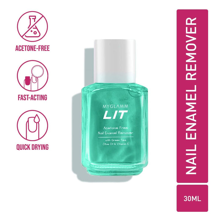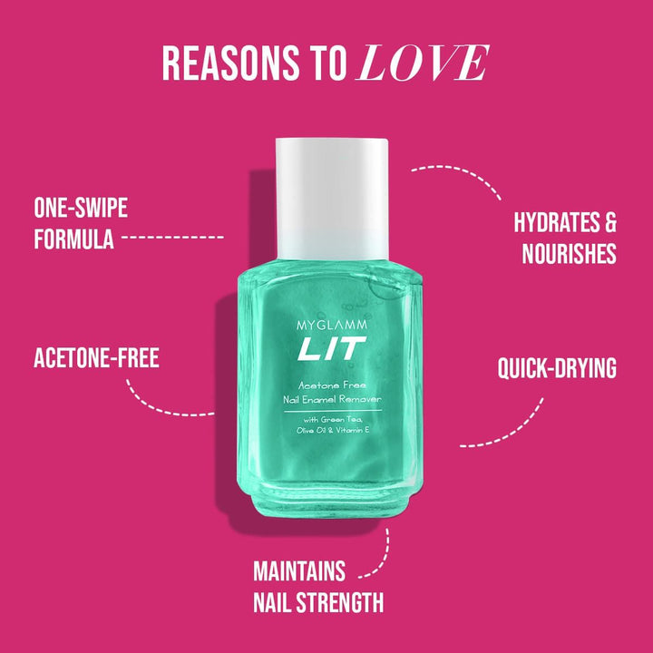 Say goodbye to stubborn nail polish with MyGlamm LIT Nail Enamel Remover—your go-to solution for effortless polish removal. This acetone-free formula is enriched with Green Tea Extracts, Olive Oil, and Vitamin E, ensuring your nails stay hydrated, nourished, and protected while removing polish in just one swipe. Designed for quick drying and residue-free removal, this nail enamel remover is perfect for those who love switching up their nail colors without damaging their nails.