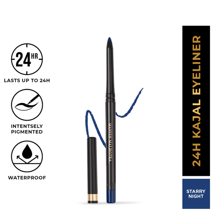 Enhance your eye makeup with MyGlamm Manish Malhotra 24H Kajal Eyeliner - Starry Night, a multitasking beauty essential that delivers deep midnight blue pigment with a matte finish. Designed for precision and versatility, this retractable kajal pencil glides effortlessly, ensuring flawless definition that lasts up to 24 hours.