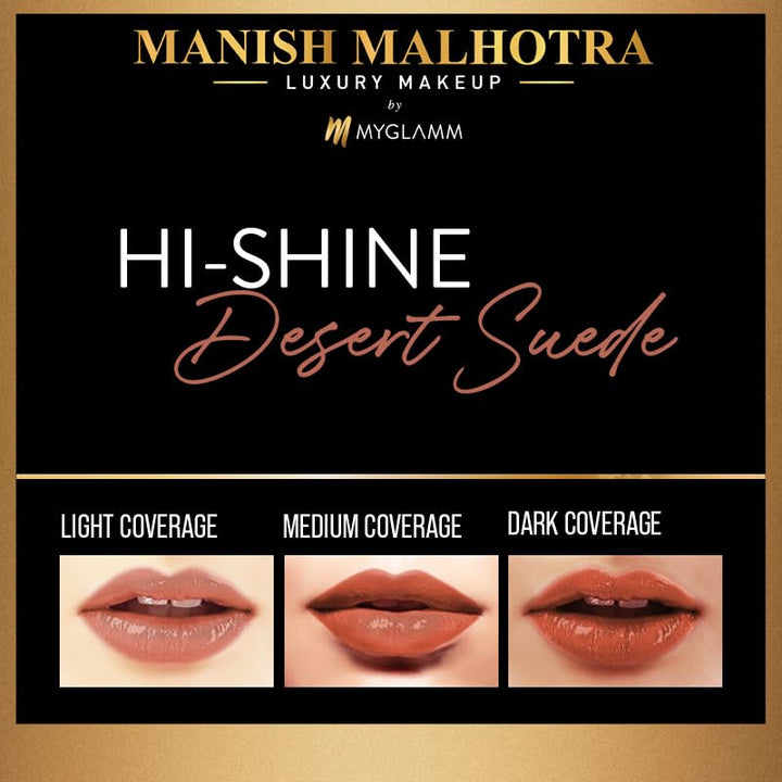 Indulge in luxury with MyGlamm Manish Malhotra Hi-Shine Lipstick - Desert Suede, a coral pink shade that complements your dewy look. This lightweight, long-wear lipstick glides effortlessly, delivering high coverage with a glossy shine. Enriched with UVB protection, it keeps your lips nourished while ensuring a smooth, creamy finish.