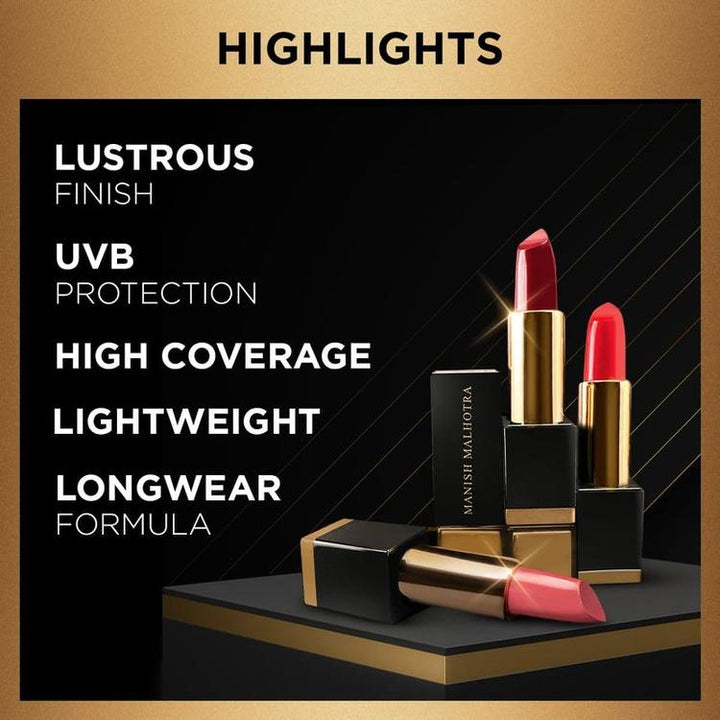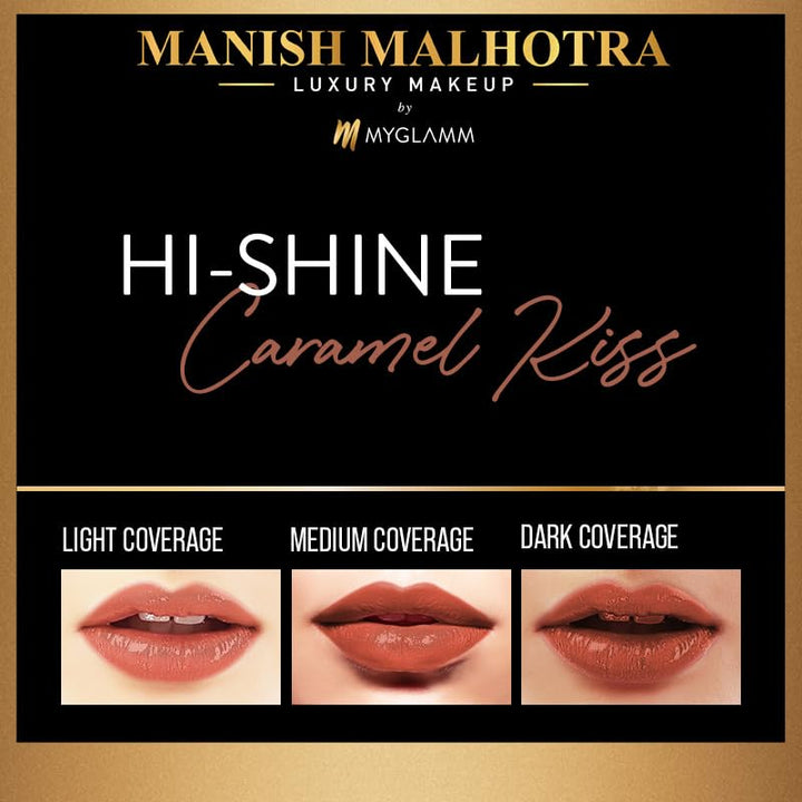 Indulge in luxury with MyGlamm Manish Malhotra Hi-Shine Lipstick - Caramel Kiss, a warm caramel tan shade that complements every skin tone. This lightweight, long-wear lipstick glides effortlessly, delivering high coverage with a satin, shine, and matte finish. Enriched with UVB protection, it keeps your lips nourished while ensuring a smooth, creamy texture.
