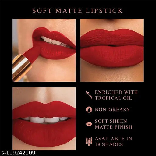 Indulge in the luxurious elegance of Manish Malhotra Soft Matte Lipstick - Romantic Rouge, a blood red shade designed to flatter all skin tones. This lipstick combines a soft matte finish with a creamy texture, ensuring a smooth, velvety application that lasts all day. Enriched with tropical oil, it keeps your lips hydrated and moisturized, making it the perfect blend of beauty and care.
