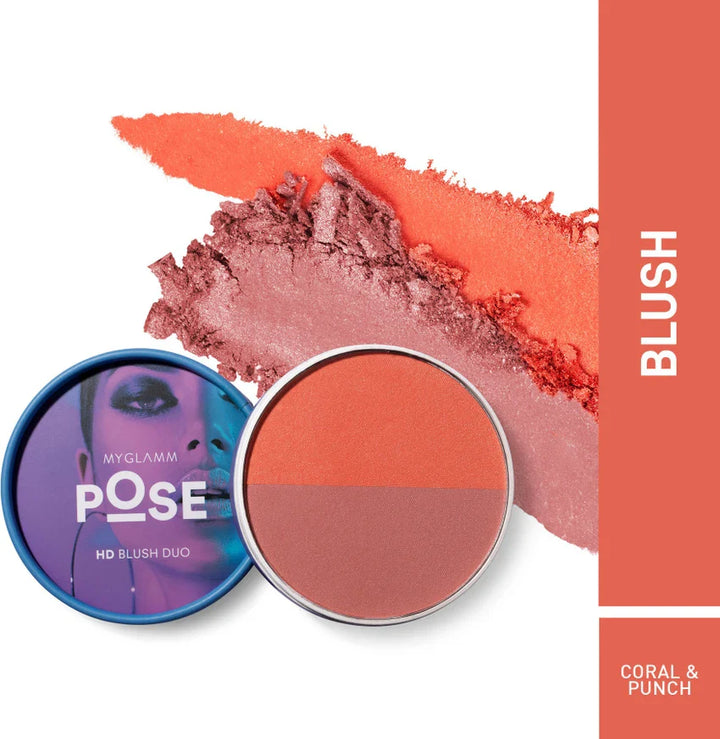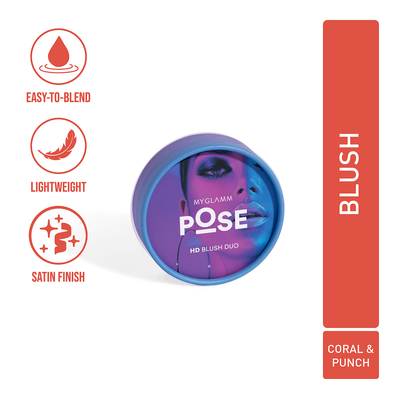 Achieve a flawless, camera-ready look with MyGlamm POSE HD Blush Duo. This high-definition, satin-finish blush duo offers two complementary shades that blend seamlessly to create a radiant glow. Designed for effortless application, this lightweight, long-lasting formula ensures smooth coverage and a soft-focus effect, making it a must-have for your makeup routine.