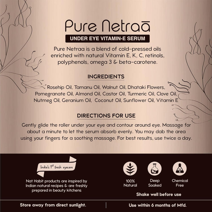 Nat Habit Pure Netraa Under Eye Serum (9.2ml) is a 100% natural, Ayurvedic blend of 12 super oils soaked in Dhataki flowers and enriched with Vitamin C, E, and Retinol. Designed to target dark circles, puffiness, fine lines, and crow’s feet, this serum delivers deep nourishment to the delicate under-eye area. Freshly prepared in Nat Habit’s Ayurvedic kitchen, it’s free from chemicals, alcohol, water, and preservatives—making it a safe and effective choice for holistic eye care.