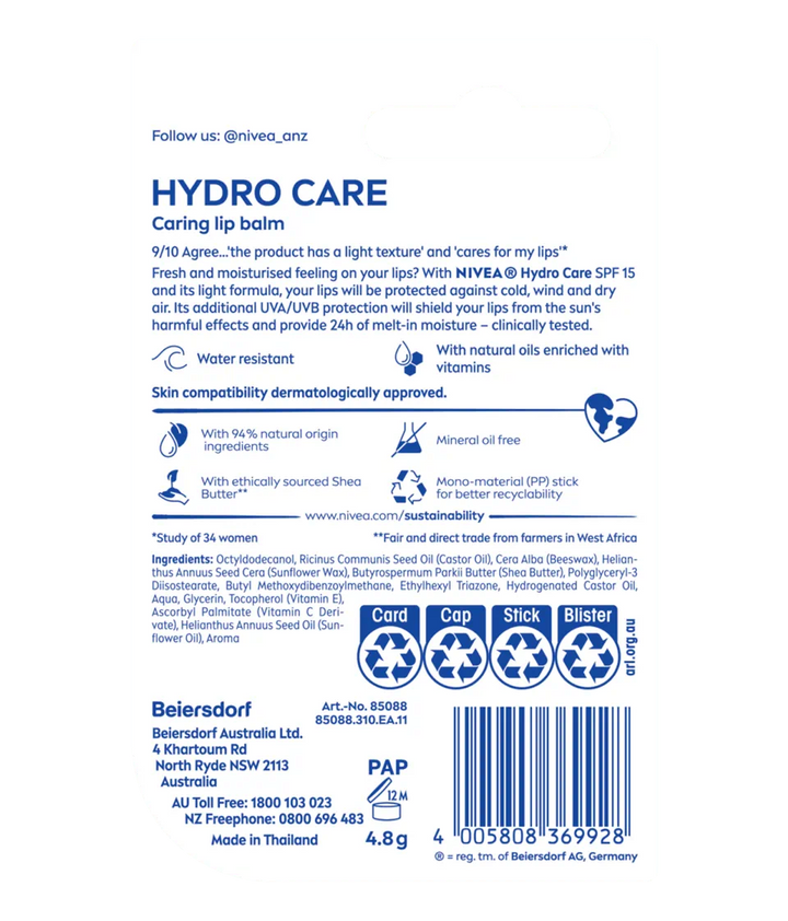 Nivea – Hydro Care Lip Balm SPF 15 (4.8g)
