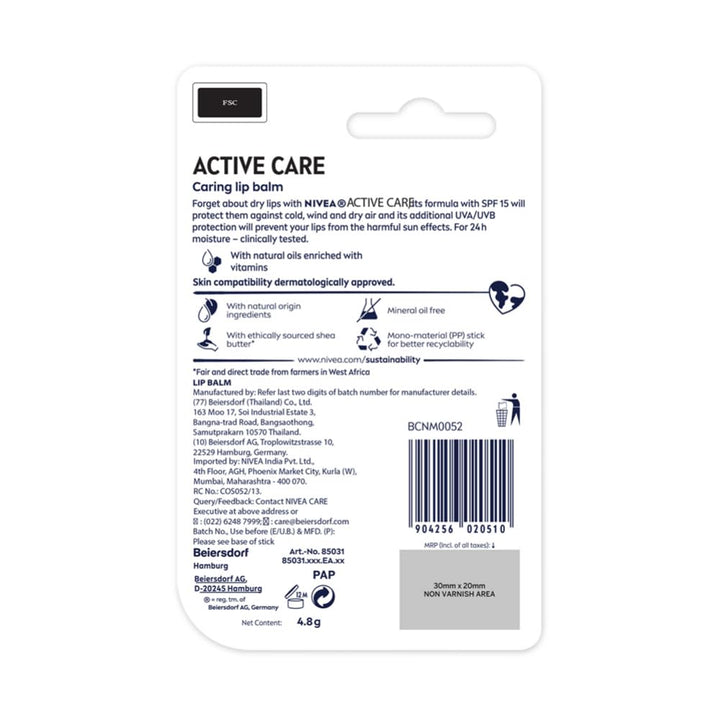 Tough on dryness, gentle on lips. The NIVEA Men B5 Active Care Lip Balm SPF 15 is specially formulated for men who want effective lip care without shine, color, or fragrance. Enriched with Pro-Vitamin B5, natural oils, and SPF 15, this balm provides long-lasting hydration while protecting your lips from sun damage and harsh weather. Its melt-in formula absorbs quickly, leaving your lips soft, smooth, and healthy-looking—without any greasy residue.