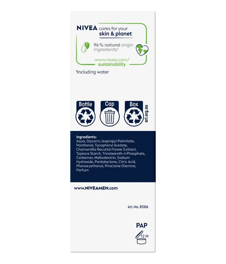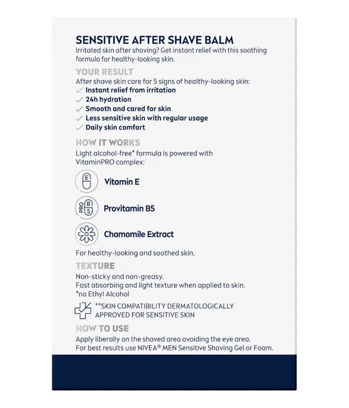 Say goodbye to post-shave irritation with NIVEA MEN Sensitive After Shave Balm, specially formulated for sensitive skin. Enriched with Chamomile Extract, Vitamin E, and Pro-Vitamin B5, this alcohol-free balm instantly soothes burning, redness, dryness, tightness, and itchiness. Its lightweight, non-greasy texture absorbs quickly, leaving your skin feeling hydrated, refreshed, and comfortable—without any sticky residue.