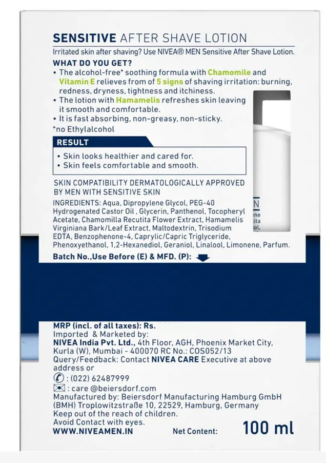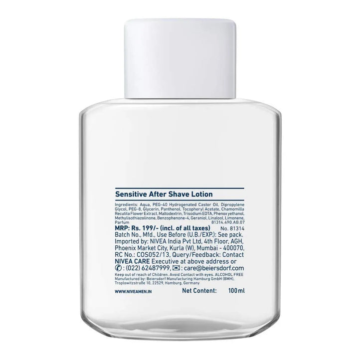 Say goodbye to post-shave discomfort with NIVEA MEN Sensitive After Shave Lotion, specially formulated for sensitive skin. Enriched with Chamomile Extract, Vitamin E, and Pro-Vitamin B5, this alcohol-free lotion instantly soothes irritation, reduces redness, and hydrates the skin after shaving. Its lightweight, fast-absorbing formula leaves your skin feeling refreshed, smooth, and protected—without any burning sensation.