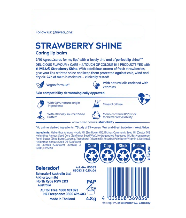 The Nivea 24 Hr Melt-In Moisture Lip Balm - Strawberry Shine is a lip care product designed to provide long-lasting hydration and moisture. It features a delicious strawberry aroma and a subtle pink shine, giving your lips a beautiful touch of color and softness. The unique formula enriched with natural oils instantly melts into your lips, keeping them moisturized for 24 hours.