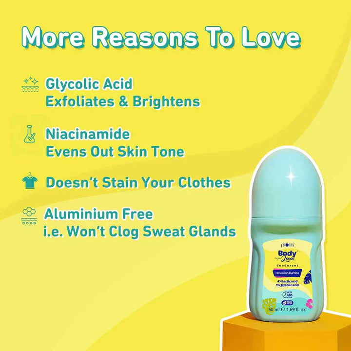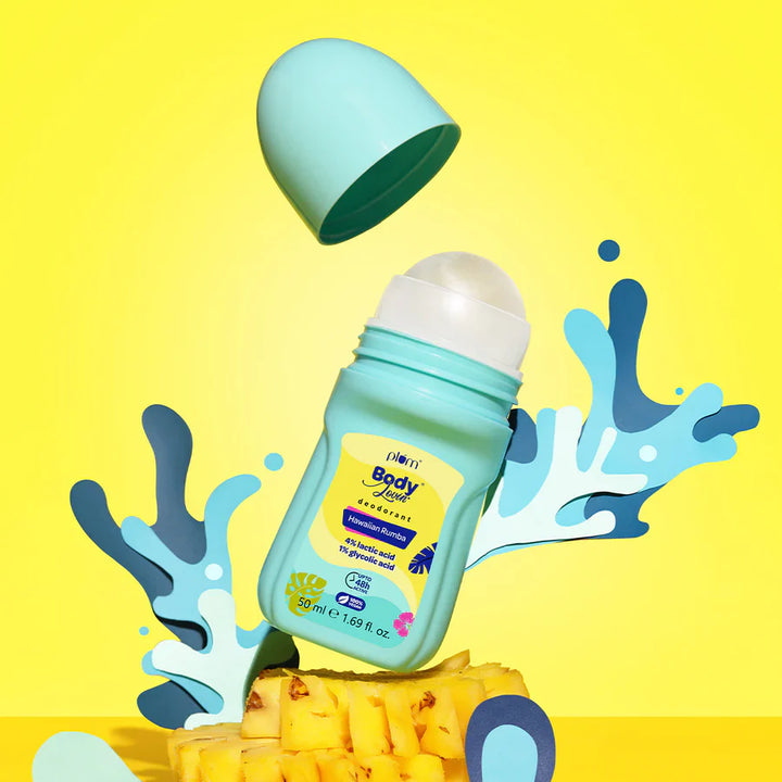 Stay fresh and confident all day with Plum Hawaiian Rumba Deodorant Roll On, a gentle yet effective deodorant infused with 4% Lactic Acid & 1% Glycolic Acid to control odor and fade underarm darkness. Designed for all skin types, this quick-drying, aluminum-free formula ensures 48-hour freshness while leaving behind a warm vanilla-inspired fragrance.