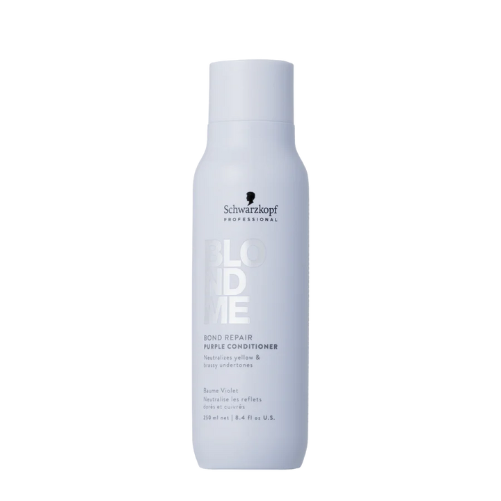 Schwarzkopf BLONDME Bond Repair Purple Conditioner 250mlย is designed to neutralize yellow undertones while preventing brassiness, ensuring your blonde hair stays fresh and vibrant.