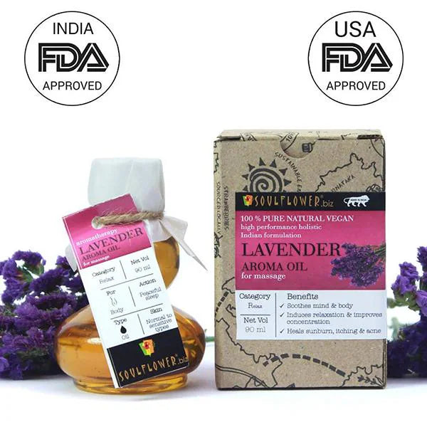 Relax and rejuvenate with SoulFlower Lavender Massage Oil, a 100% natural, soothing blend designed to relieve stress, calm the mind, and nourish the skin. Infused with Lavender Essential Oil, Vitamin E, Jojoba, Sesame, and Olive Oils, this lightweight, non-greasy formula deeply hydrates the skin while promoting relaxation and improving circulation. Ideal for stress relief, muscle relaxation, and aromatherapy, this oil ensures a luxurious spa-like experience at home.