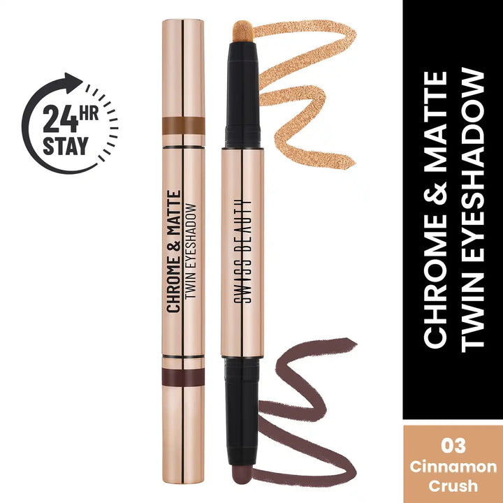 Unleash the magic of dual-finish eyeshadow with Swiss Beauty Chrome & Matte Twin Eyeshadow - Shade No. 03 Cinnamon Crush. This innovative 2-in-1 eyeshadow stick combines a rich matte and a shimmering chrome finish, allowing you to create versatile eye looks effortlessly. Whether you desire a subtle daytime elegance or a bold, mesmerizing evening glam, this twin eyeshadow stick is your perfect companion.