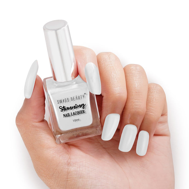 Achieve a flawless, elegant nail look with Swiss Beauty Stunning Nail Lacquer in the Glam White shade. This high-shine, chip-resistant nail polish delivers long-lasting wear with a quick-drying formula, ensuring a salon-like finish every time. Designed with ultimate suspension gel technology, it provides rich color payoff and radiant shine, making it a must-have for every beauty enthusiast.