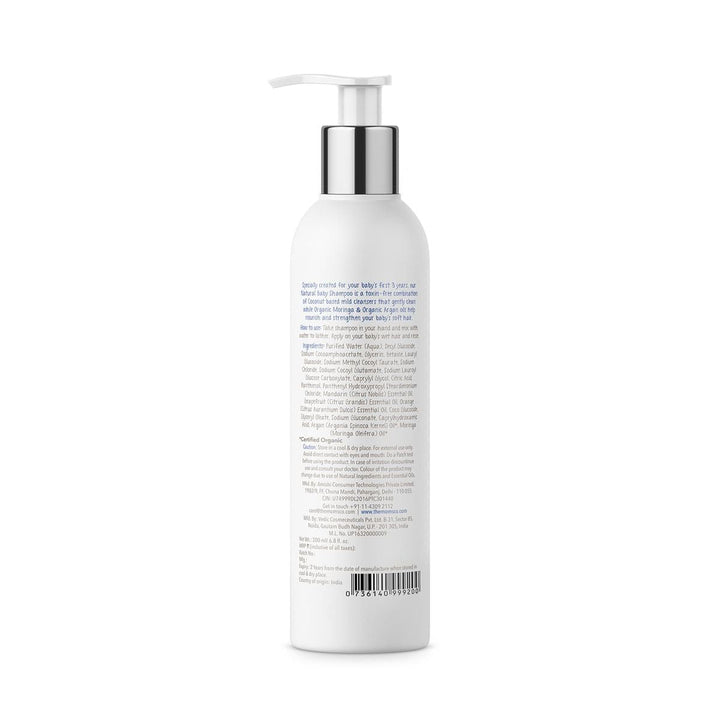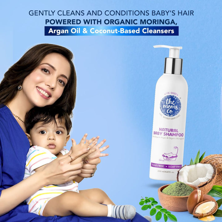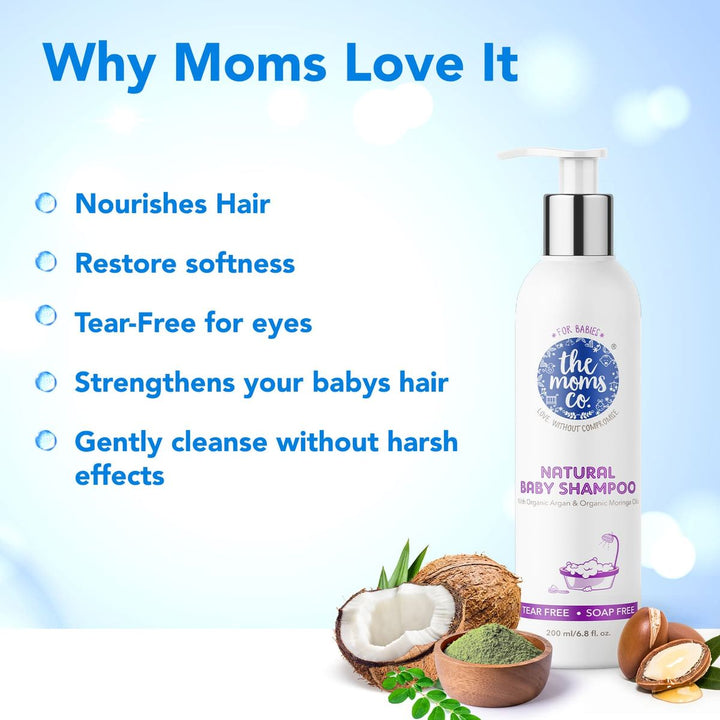 The Moms Co. Natural Baby Shampoo 200ml is a gentle and nourishing shampoo specially formulated for your baby's delicate hair and scalp. Enriched with organic Moringa and Argan Oil, this shampoo gently cleanses, conditions, and strengthens your baby's hair, leaving it soft and healthy. The tear-free and soap-free formula ensures a safe and enjoyable bath time for your little one.
