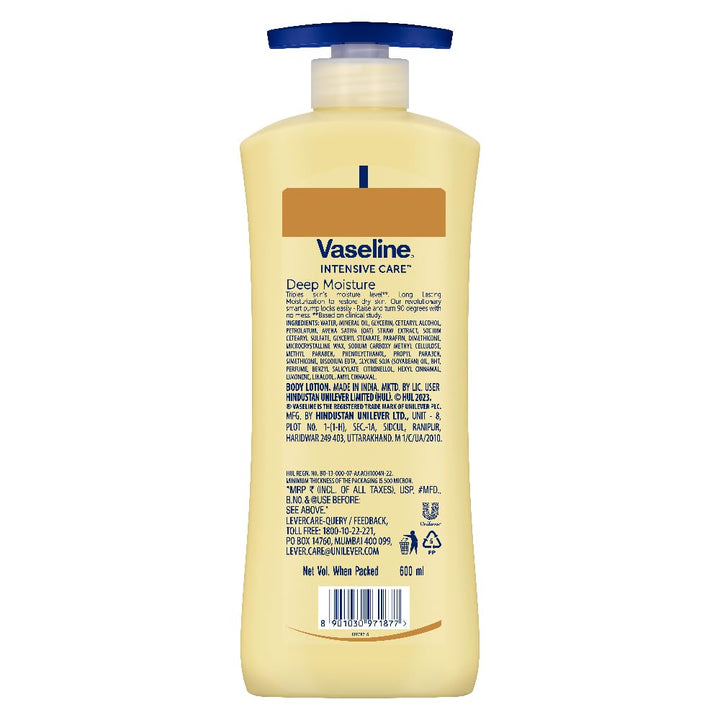 Experience deep, all-day hydration with Vaseline Intensive Care Deep Moisture Body Lotion 600โฏml. Specially formulated to restore, protect, and nurture dry, tired skin, this premium lotion penetrates deeply to lock in moisture and improve skin texture. Its rich yet non-greasy formula is quickly absorbed, leaving your skin velvety soft, smooth, and radiant throughout the day. Whether youโre combating seasonal dryness or daily exposure to harsh environmental conditions, this body lotion provides a protective barrier that reinforces your skinโs natural moisture balance.