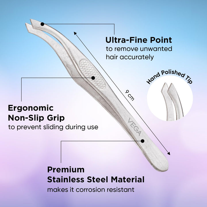 Achieve salon-quality grooming at home with the Vega Tweezer Slant Tip – TW-03, a precision-crafted beauty tool designed for effortless and accurate hair removal. Made from premium stainless steel, this tweezer features a hand-polished slant tip that’s perfectly aligned to grip even the finest hairs at the root. Whether you're shaping your brows or removing stray facial hair, the ergonomic design ensures a comfortable and controlled experience.