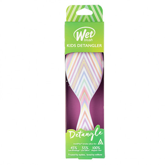 The Wet Brush Kids Detangler Hair Brush Chevron Stripe is specially sized and shaped to fit a childs hand and easily loosens knots without pulling or breaking hair. Effortlessly and painlessly detangles wet or dry hair due to WetBrushs exclusive IntelliFlex bristles. From the moment kids try it, theyll never scream (from hair brushing) again. Limited edition print.