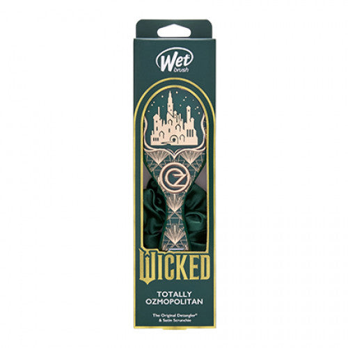 Effortless daily detangling with the limited edition WetBrush Wicked Emerald City Detangling Kit. Perfect for creating your daily looks, including detangling and styling, with less pain, effort and breakage. This Wet Brush kit includes the world famous Original Detangler with an Emerald City inspired print, as well as a Satin Scrunchie. 100% happier hair with the Original Detangler featuring exclusive IntelliFlex bristles, while the Satin Scrunchie adds some Emerald City to your day.